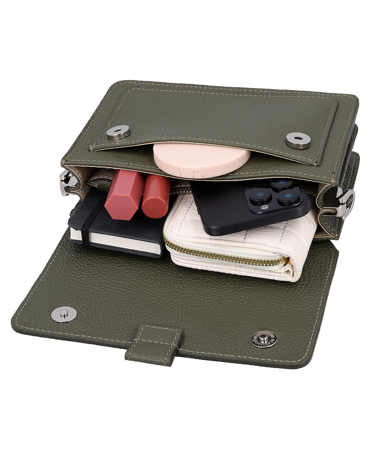 Trude yhdistää italialaisen käsityötaidon ja käytännöllisyyden. Laadukas nahka, jossa on Made in Italy -logo, yhdistyy integroituun AirTag-lokeroon, sisäpuolella olevaan vetoketjutaskuun ja irrotettavaan avaimenperään, kun taas magneettikansi ja säädettävä ja irrotettava olkahihna takaavat joustavuuden ja turvallisen sulkemisen.