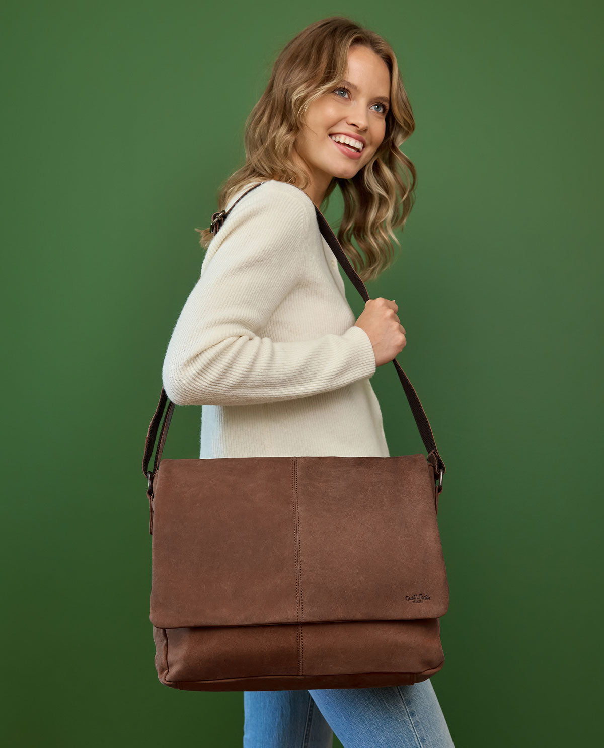 Meidän olkalaukku on valmistettu korkealaatuisesta, kestävästä nahasta. Kestävä materiaali saa ajan myötä oman luonteen ja kehittää ainutlaatuisen patinan. Jokainen laukku on käsintehty ja sillä on omat ainutlaatuiset piirteensä, jotka tekevät siitä ainutlaatuisen esineen. Ruskea väri tuo laukulle autenttisen vintage-ilmeen, joka sopii täydellisesti jokaiseen asuun. Lisäksi laukussa on riittävästi säilytystilaa: pääosasto on riittävän suuri tabletille, kannettavalle tai tärkeille asiakirjoille. Kaksi sisätaskua ja vetoketjutasku pitävät tavarasi järjestyksessä, kun taas säädettävä olkahihna takaa optimaalisen kantomukavuuden – joko rentona olkapäällä tai poikittain kehossa.