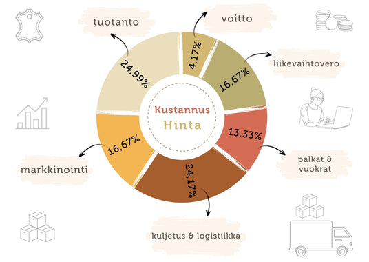 Laadukas nahka ei tarvitse olla kallista! Hintamme ovat läpinäkyviä, vakaita ja tietoisesti laskettuja – ilman piilokustannuksia. Oman tuotannon, kestävän pakkauksen ja harkitun logistiikkajärjestelmän ansiosta voimme tarjota nahkatuotteitamme lyömättömään hintaan. Saat siis parasta laatua ilman kompromisseja. Tavoitteemme? Että uusi nahkatuotteesi ei ole vain edullinen, vaan myös jokapäiväinen kumppanisi!