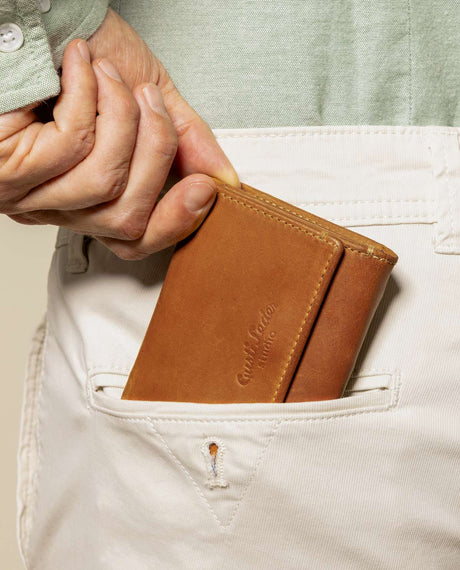 Lompakkomme on valmistettu eri nahkalaaduista, jotka eroavat ulkonäöltään, tuntumaltaan ja kestävyydeltään. Kitzinnahka on erityisen pehmeää ja joustavaa, ihanteellinen miellyttävään tuntumaan. Naudannahka tarjoaa tukevan rakenteen ja kestävyyttä, kun taas puhvelinnahka on erityisen vastustuskykyistä ja kehittää ajan myötä luonteenomaista patinaa. Valitse materiaali, joka parhaiten sopii arkeesi!