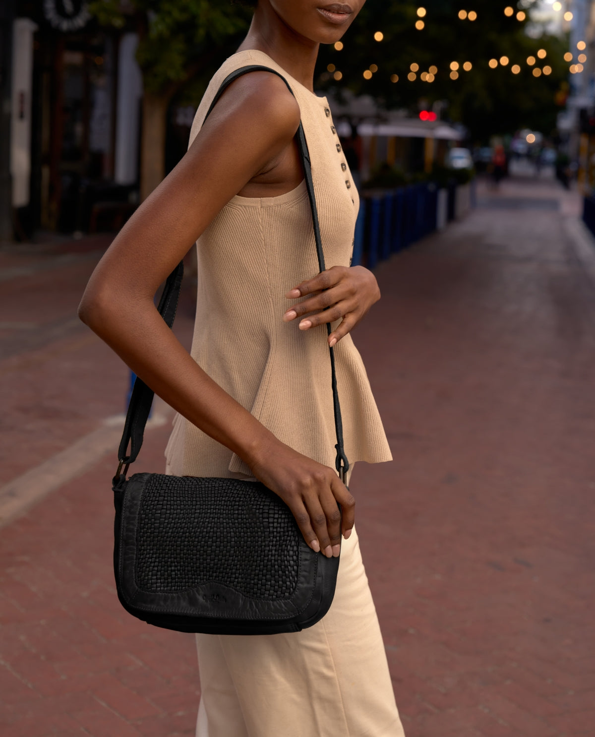 Pieni käsilaukku "Aliya" on musta nahkainen käsilaukku naisille, joka kiinnittää heti huomion punotulla pinnallaan. Pesu käsitelty Naudan nahka tuntuu miellyttävän pehmeältä ja antaa laukulle rennon, korkealaatuisen ilmeen. Aliya on käytännöllinen jo jokapäiväisessä käytössä: piilotettu AirTag-lokero tarjoaa lisäsuojaa, ja säädettävä olkahihna mahdollistaa joustavan kantamisen. Etupuolella oleva magneettikiinnitys ja yksi päälokero, jossa on vetoketju, yhdistyvät mukavasti ja turvallisesti.