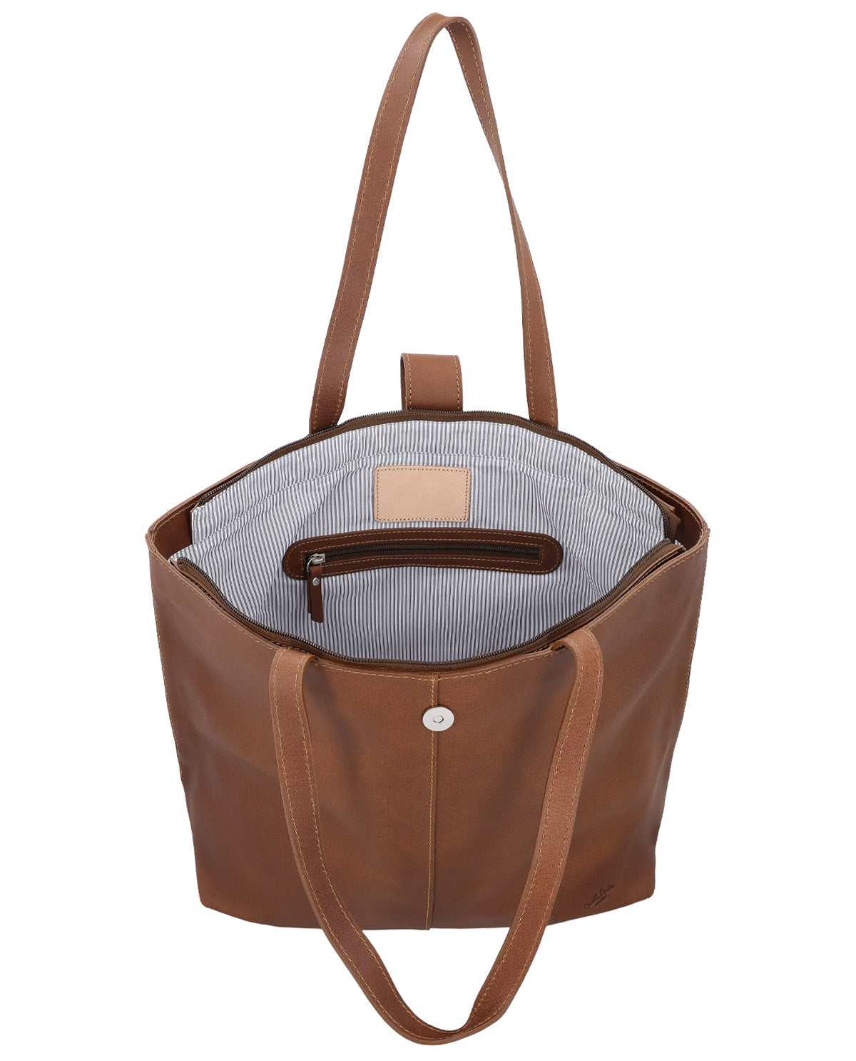 Salainen aseemme "Alexandra" on todellinen monitoimitalentti. Missä tahansa oletkin menossa, "Alexandra"-ostoskassi ruskeana seuraa sinua: yliopistoon, töihin, shoppailukierrokselle kaupungille tai retkelle. Kokoaan ansiosta laukku on täydellinen joka tilanteeseen ja tarjoaa riittävästi säilytystilaa kaikille tavaroillesi. Vahva ja kestävä härännahka ei vain tuo laukulle ylellistä ilmettä, vaan takaa myös tarvittavan vakauden. Berliinin suurkaupungin tunnelma on inspiroinut tätä laukkua, joka heijastaa urbaania elämäntyyliä ja yhdistää käytännöllisyyden muodikkaaseen chic-tyyliin.