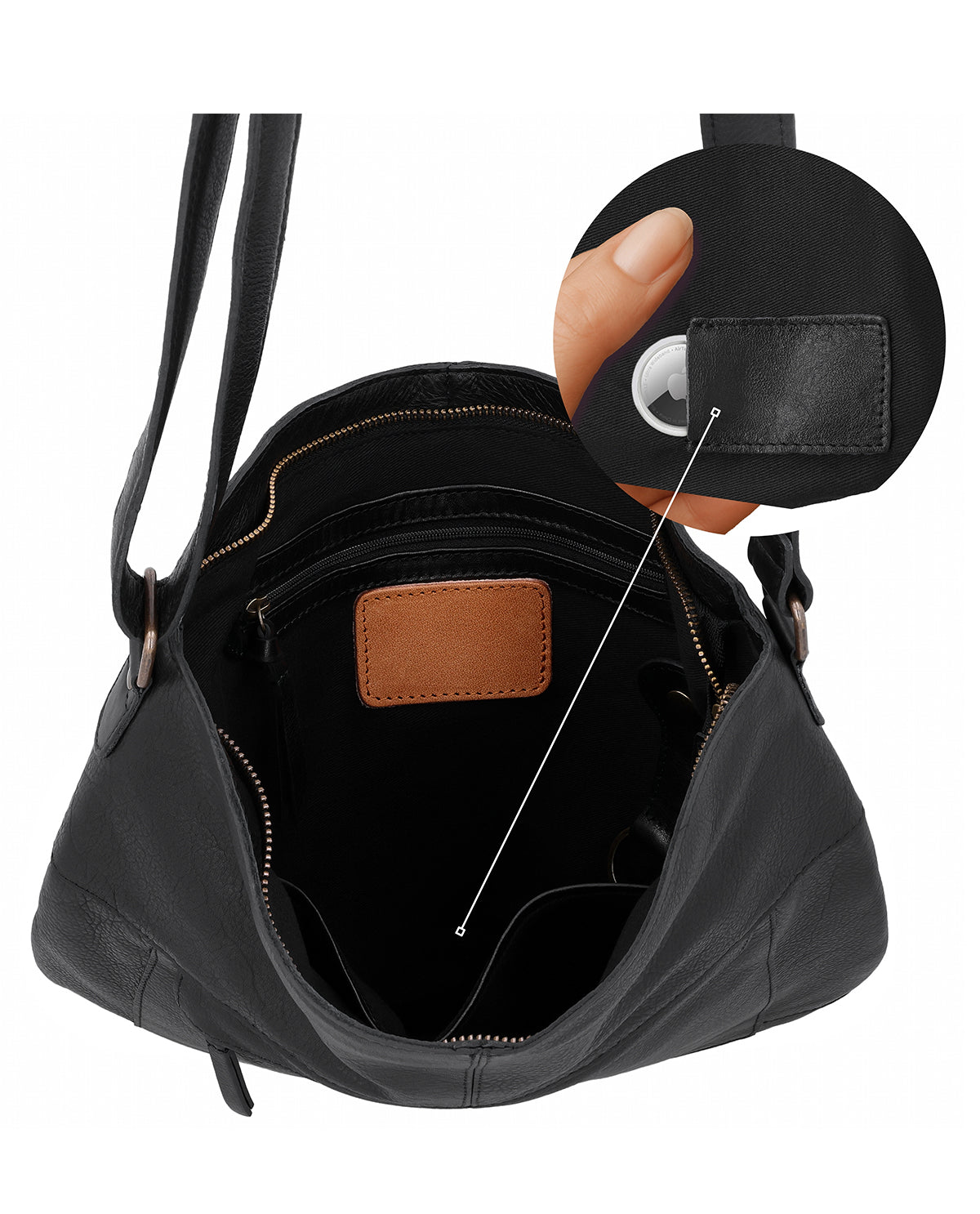Das großzügige Hauptfach dieser hochwertig gearbeiteten Umhängetasche aus Leder, in dem Du ohne Weiteres Unterlagen bis zu einer Größe von DIN A4 unterbringen kannst, sowie die zusätzlichen Steckfächer und das Reißverschluss-Innenfach bieten Dir einen optimalen Überblick über die Essentials in Deiner Tasche, ohne dass Du lange kramen musst. Damit Deine Schlüssel nicht im Taschenchaos verschwinden, verfügt "Maola" zusätzlich über einen praktischen Schlüsselringhalter. Für extra Sicherheit unterwegs ist außerdem ein geheimes AirTag-Fach integriert, damit Du Deine Tasche jederzeit leichter wiederfindest. Und damit all das, was Du bei Dir trägst, auch sicher verstaut und gut geschützt ist, schließt "Maola" mit einem weiten stabilen Reißverschluss. Außerdem ist auf der Vorderseite ein weiteres Reißverschlussfachins Design integriert , in dem Du kleinere Dinge wie Smartphone oder Kopfhörer immer griffbereit verstauen kannst. Der längenverstellbare Trageriemen sorgt derweil für die nötige Portion Tragekomfort und Flexibilität, sodass Du "Maola" wahlweise als Schultertasche mit kurzem Träger oder als klassische Cross Body-Bag tragen kannst.