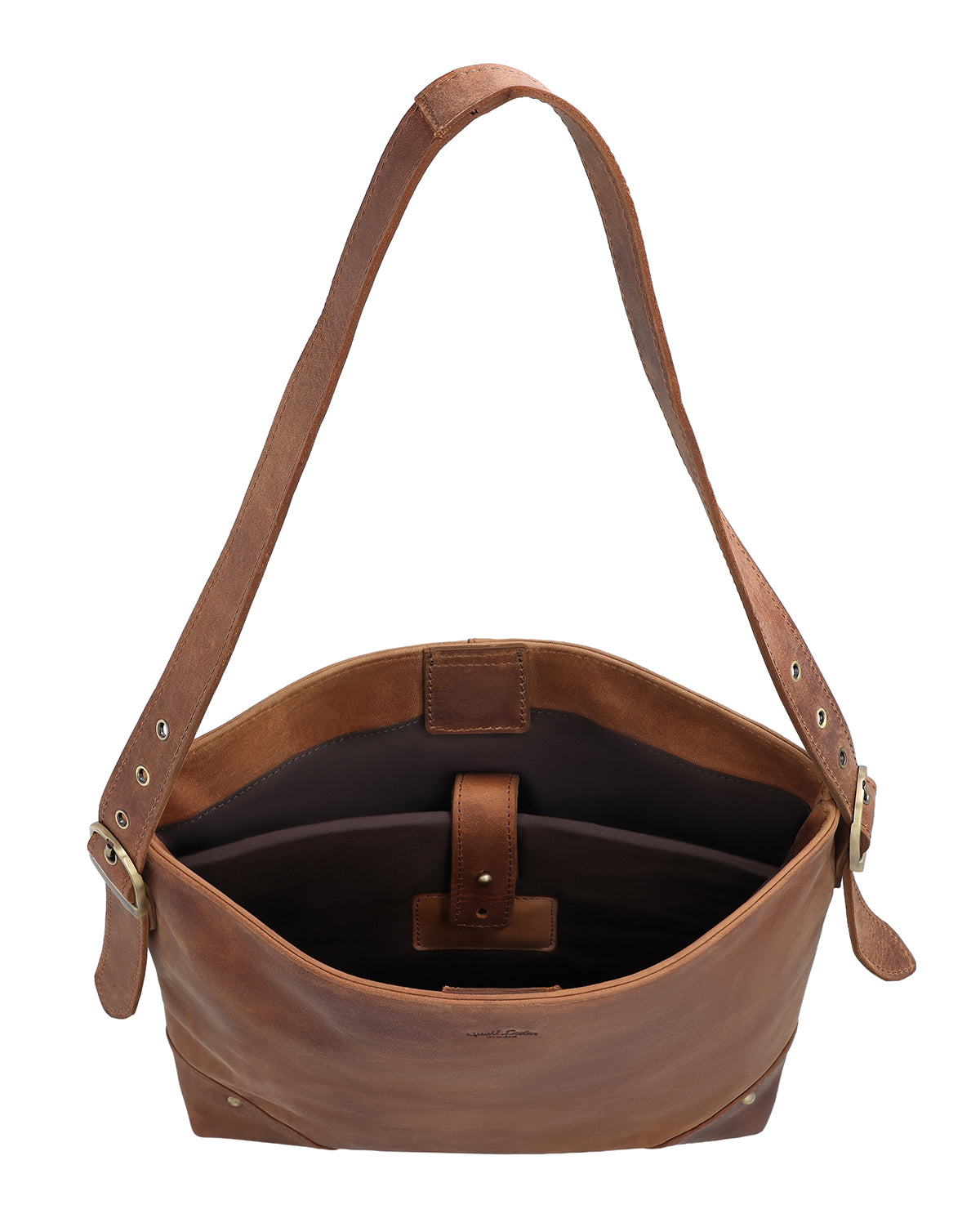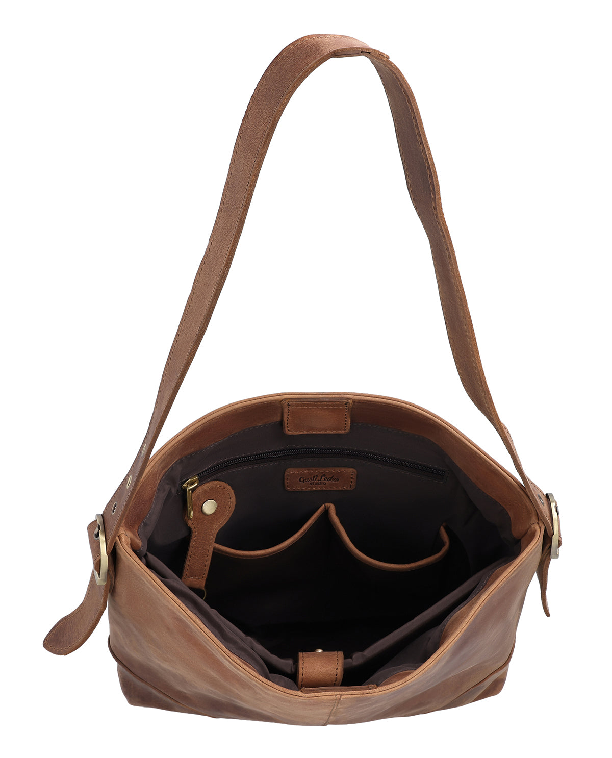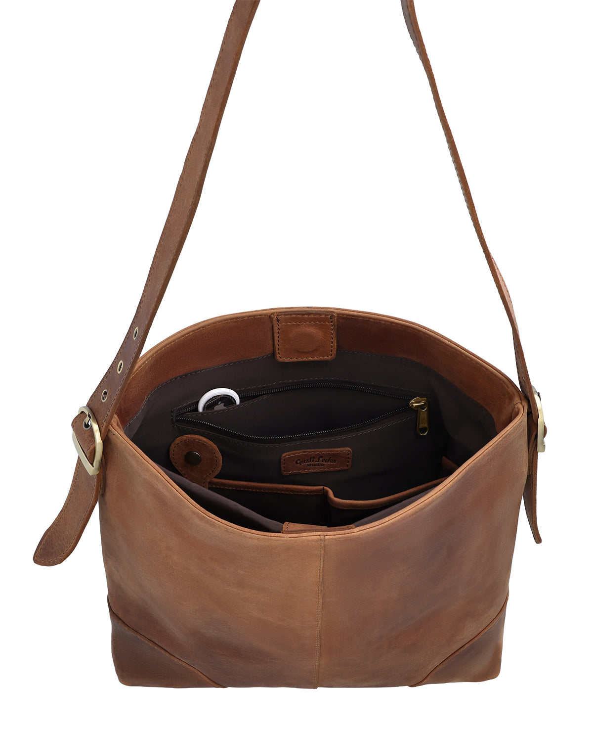 "Moje" impresses not only with its functionality, but also with its high-quality details. The interior compartment offers an additional zippered compartment for even more security and storage space. A subtle Gusti patch rounds off the design, while the engraved patch on the bag adds a personal touch. The decorative brass rivets on the front corners add that certain something. The bag is an ideal choice for women who value both style and practicality – perfect for everyday use, at the office, or when traveling.