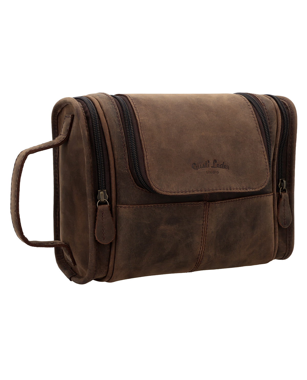 You could play hide-and-seek in this toiletry bag if you were an elf. Super spacious “Chester” has plenty of space for your toiletries. There are multiple pockets inside where you can organise your bathroom essentials. Use the two side pockets for things you need easy access to. Hang “Chester” up using the hanging loop while you’re using him. “Chester’s” lining is water-resistant, so no need to worry about small spillages. We’ve created a Gusti Leather toiletry bag that isn’t just functional, it’s super stylish too. Choose between a stylish brown or elegant black toiletry bag for your next trip away. What more could you want? You’ll never have to compromise in the bathroom again with our spacious toiletry bag “Chester”.
