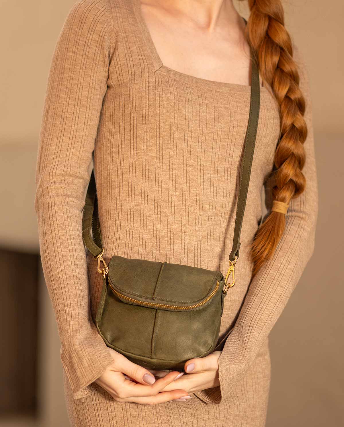 Vegetable tanned handbag shoulder bag women khaki leather
