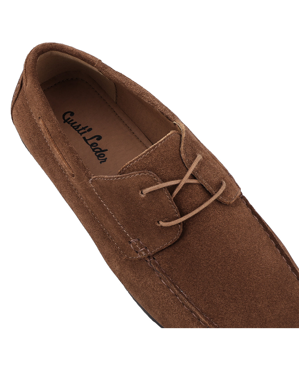 The "Elex" moccasin is the perfect choice for men who want to combine relaxed style with high-quality comfort. Made from fine cognac-colored suede, it adds a warm, masculine touch to your outfit and can be combined in many ways—whether with chinos, jeans, or summer fabric pants. The soft surface of the leather ensures a comfortable fit and emphasizes the high-quality character of the shoe. Thanks to its flexible construction, "Elex" will reliably accompany you through long days and offer you exactly the balance of style and comfort that you value in everyday life.