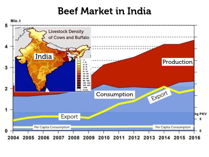 Nykyään Intia on yksimaailman suurimmista naudanlihan tuottajista. Vertailun vuoksi: EU:ssa tuotetaan vuosittain noin 8 miljoonaa tonnia naudanlihaa. Intiassa se on 4,3 miljoonaa tonnia. Naudanlihaa ei siis vain kuluteta Intiassa, vaan sitä myös tuotetaan nykyään laajassa mittakaavassa. Suurin osa Intian teurastamoista sijaitsee etelässä (Chennai) ja pohjoisessa (Uttar Pradesh ja Kolkata). Näistä paikoista tulee jopa 50 % lihasta vientiin Qatariin ja Saudi-Arabiaan. Miksi? Eläinten teurastus tapahtuu tarkkojen sääntöjen mukaan, jotka ovat juurtuneet islamiin. Vain jos liha on”halal”, sitä syödään myös islamilaisissa paikoissa kuten Qatarissa.