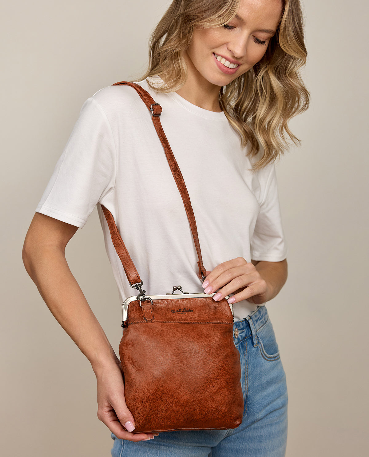 Laukussa on sisällä yksi päälokero ja pieni vetoketjullinen tasku. Näin tavarasi eivät voi pudota ulos ja ovat hyvin suojassa. Kestävä naudannahka viimeistelee muotoilun. Tilaa on muistikirjalle, kännykälle, huulipunalle ja lompakolle.