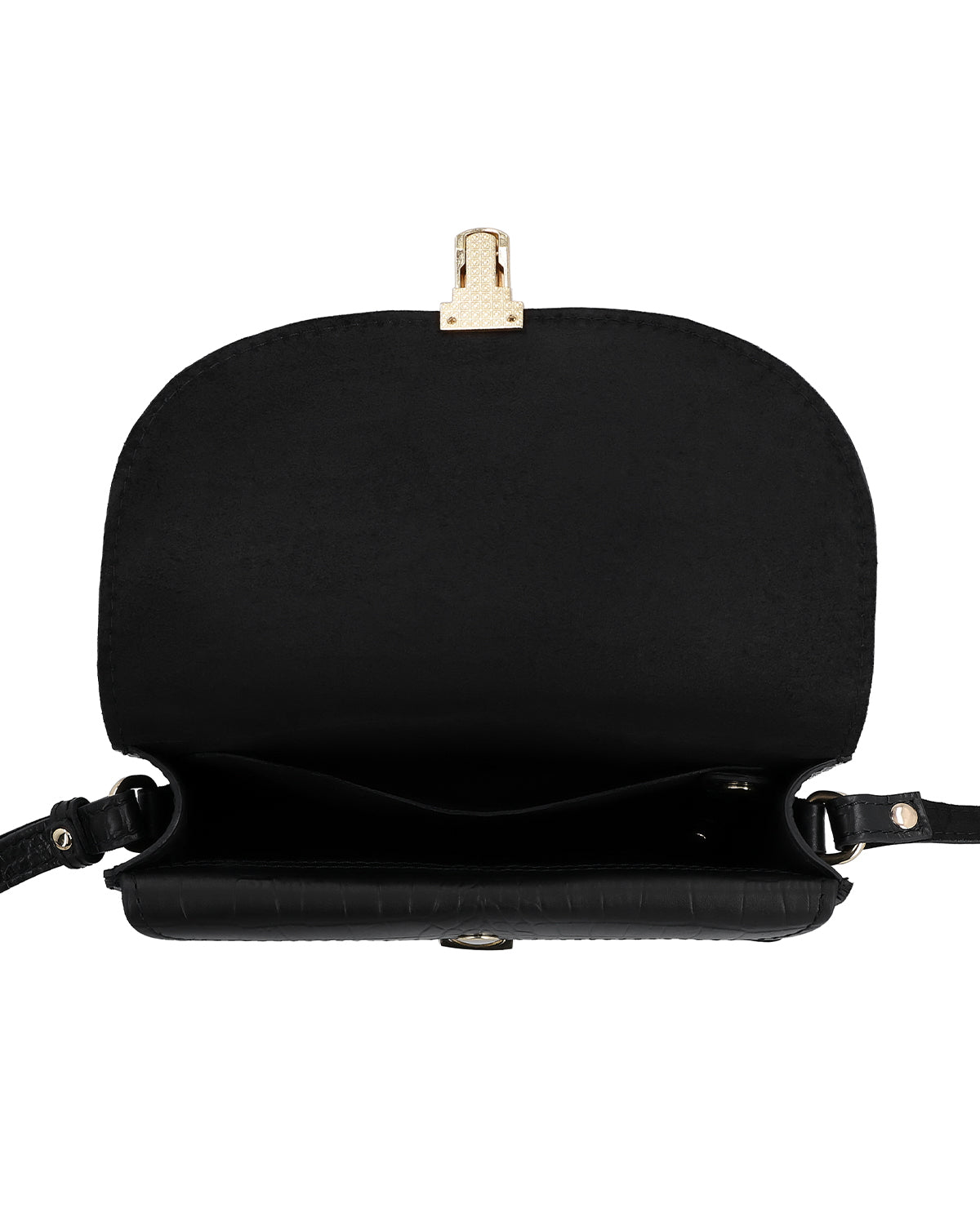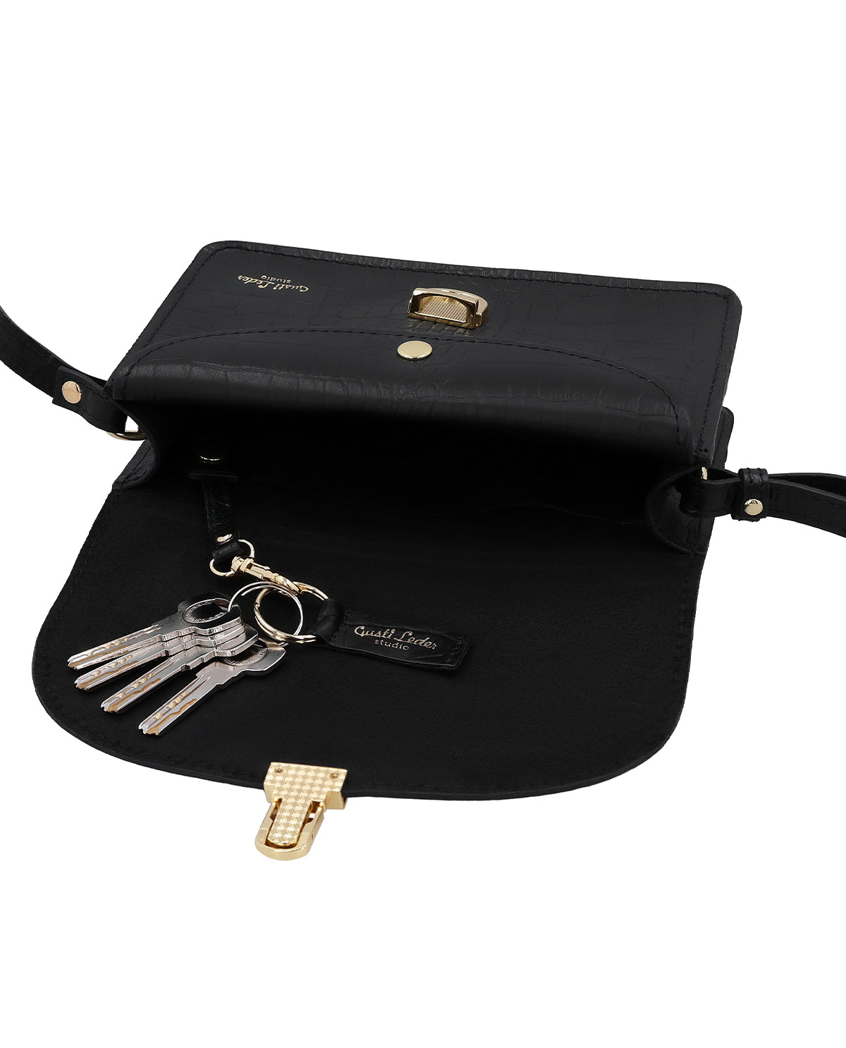 Etsitkö sitä crossbody-laukkua, joka tekee yöstä päivän? Mutta joka myös arjessa kohottaa asua? Tässä tulee „Sandy“ pelastamaan! Sen kapea muoto tekee siitä ihanteellisen olkalaukun. Krokotiiliefekti erottuu hillitysti laukun syvänmustasta naudannahasta ja hurmaa tyylillä kultaisilla yksityiskohdilla.