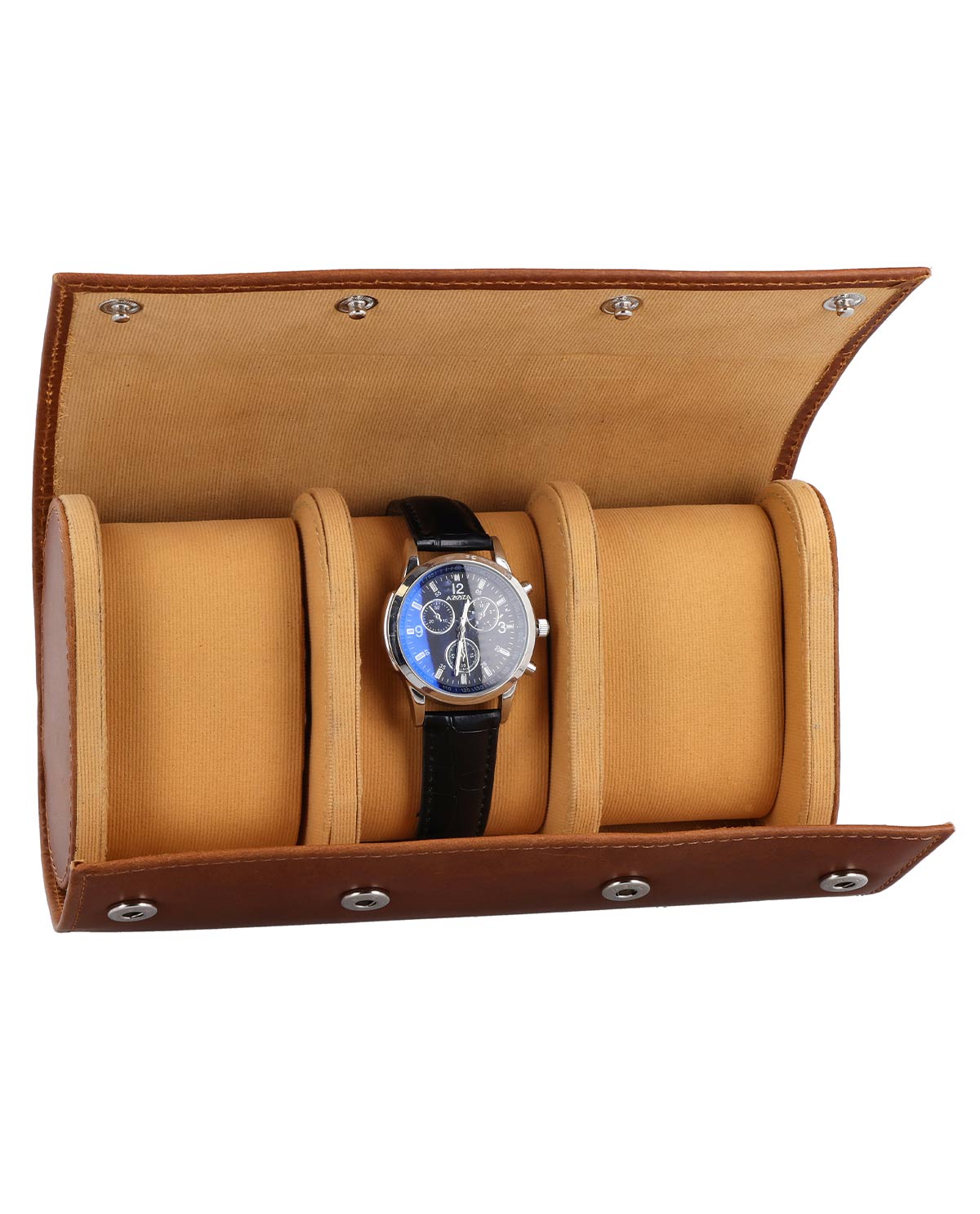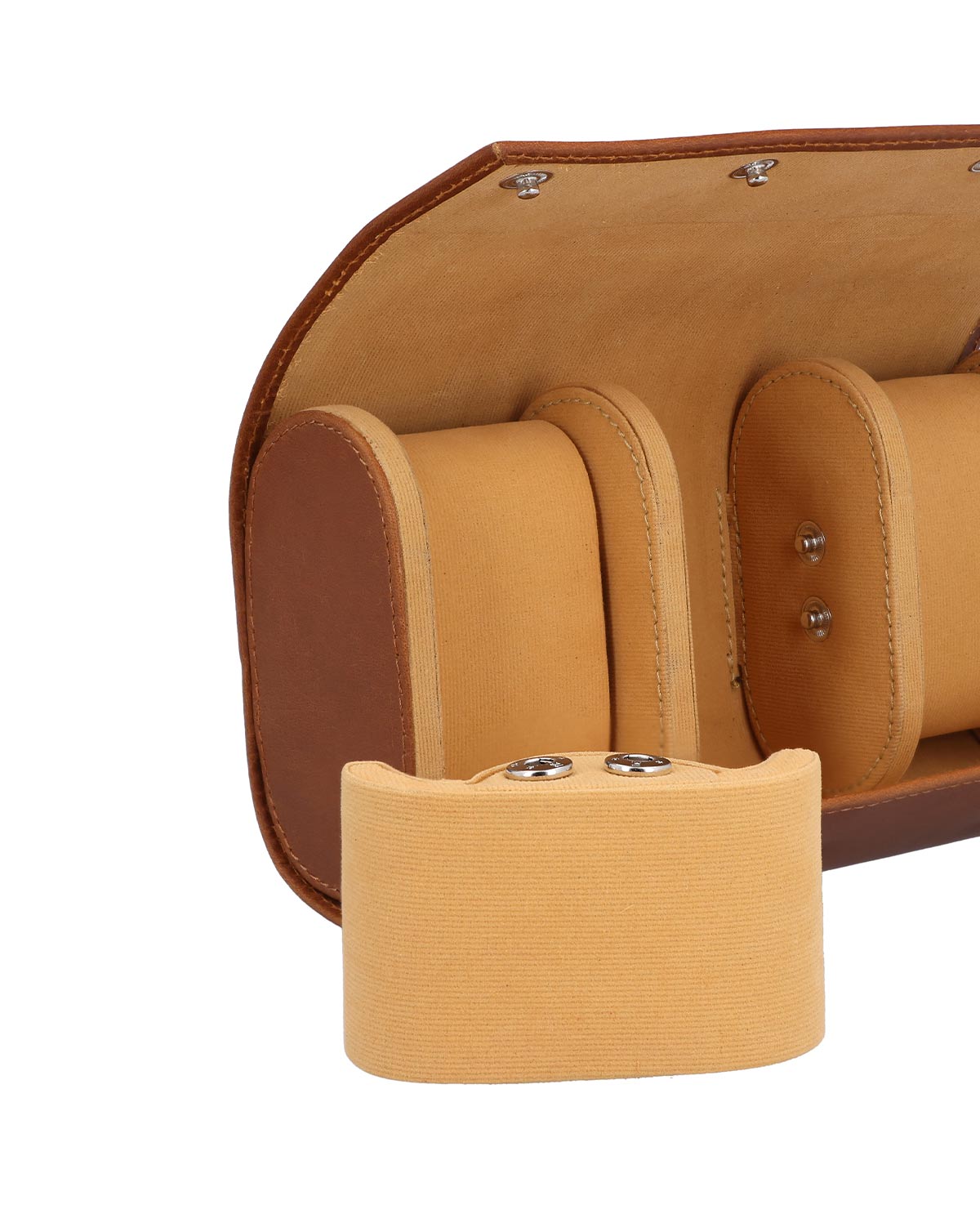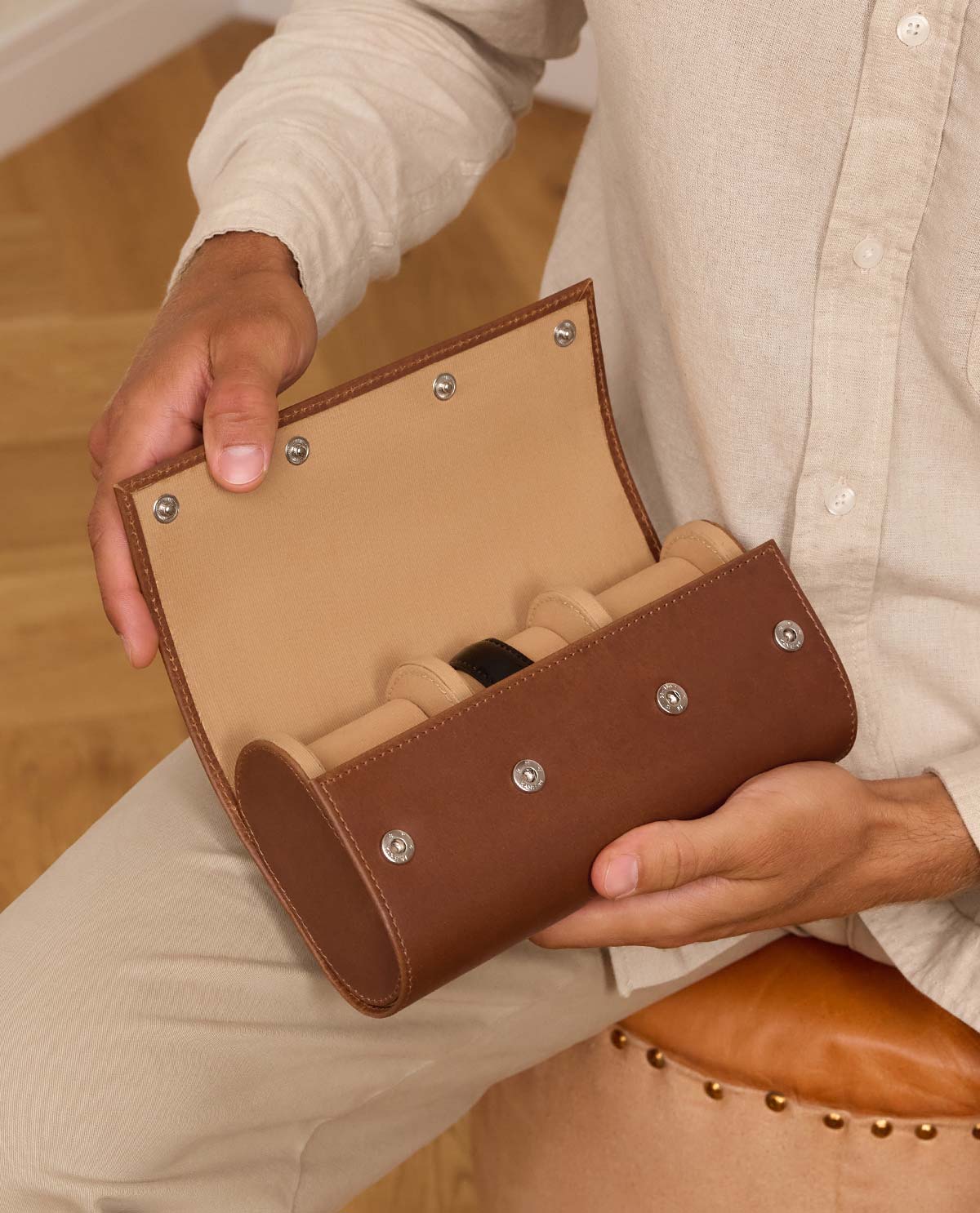 "Neven" tarjoaa tilaa kolmelle kellolle, jotka lepäävät erikseen pehmustetulla tyynyllä. Näin aikamittarisi pysyvät tukevasti paikoillaan, jopa matkan aikana. Painonapit varmistavat turvallisen sulkemisen, samalla kun ne mahdollistavat nopean pääsyn. Kompakti koko ja laadukas tuntuma tekevät "Neven"istä ihanteellisen kumppanin kellokeräilijöille, paljon matkustaville tai tyylikkään säilytyksen ystäville. Täydellinen yhdistelmä suojaa, tyyliä ja laatua – kauneimmille kelloillesi.