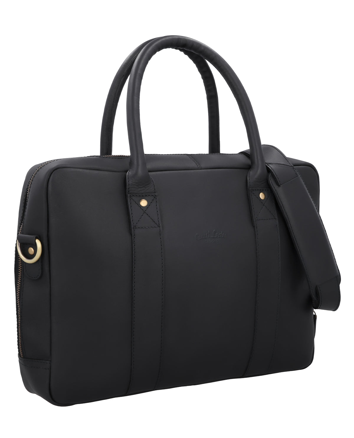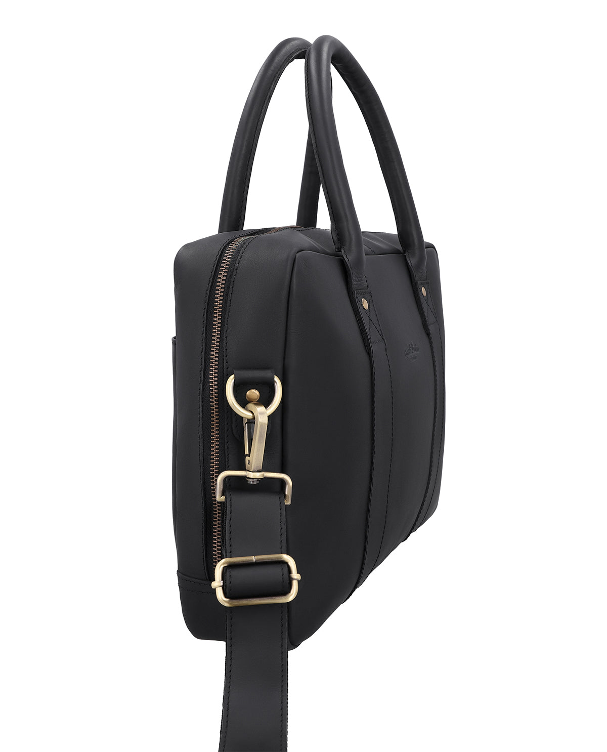 Sisällä vetoketjutasku täydentää selkeää jakoa, kun taas integroitu avaimenperä pitää tärkeät tavarat käden ulottuvilla. Säädettävä ja irrotettava olkahihna tarjoaa joustavat kantovaihtoehdot, ja pehmeä olkapäätyyny lisää mukavuutta. Ulkopuolella oleva kaiverrettava lappu mahdollistaa henkilökohtaisen viimeistelyn. Fynn on musta nahkainen liiketoimintalaukku naisille ja miehille, joka yhdistää toiminnallisuuden, kestävyyden ja käytännöllisyyden modernissa designissa.