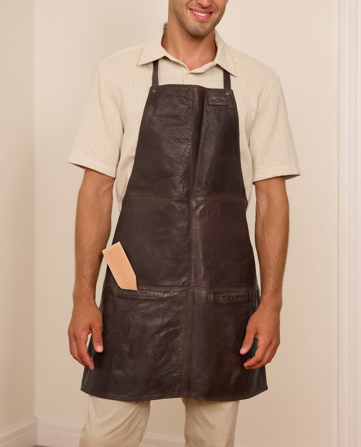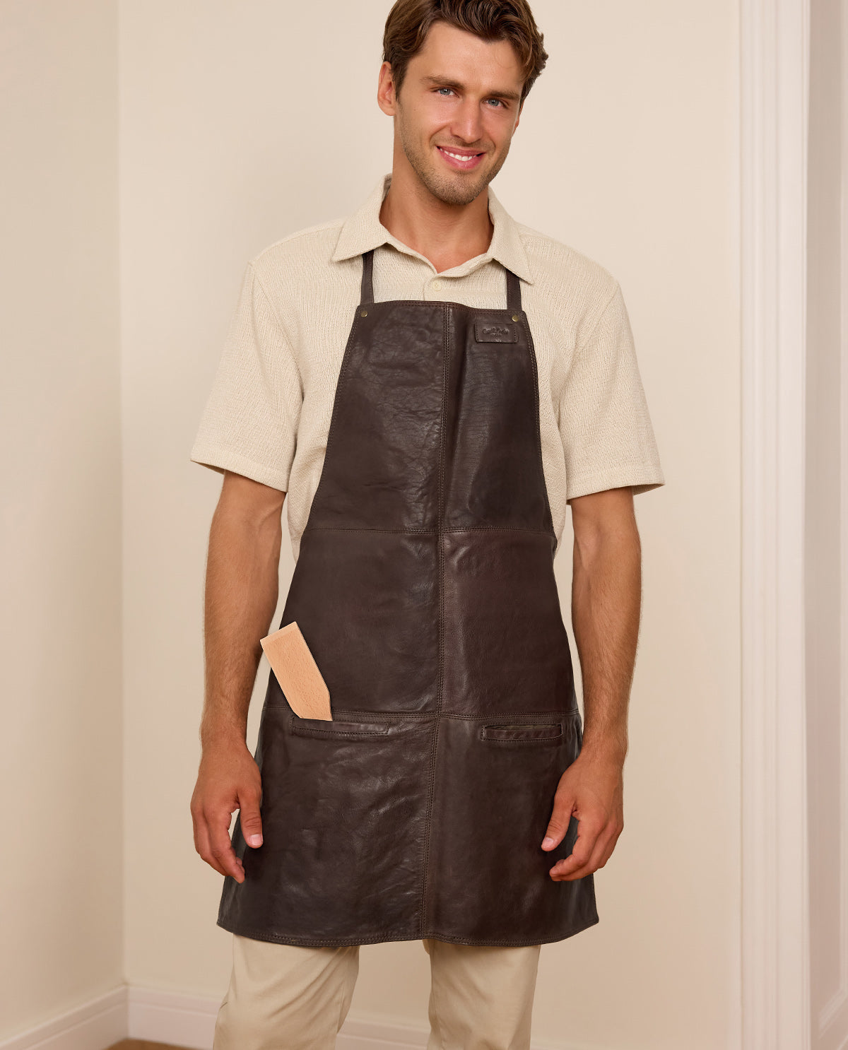 Olitpa sitten intohimoinen grillimestari tai keittiötaitojasi hiova kokki, tämä nahkaesiliina suojaa vaatteitasi ei-toivotuilta tahroilta, roiskeilta ja lialta.