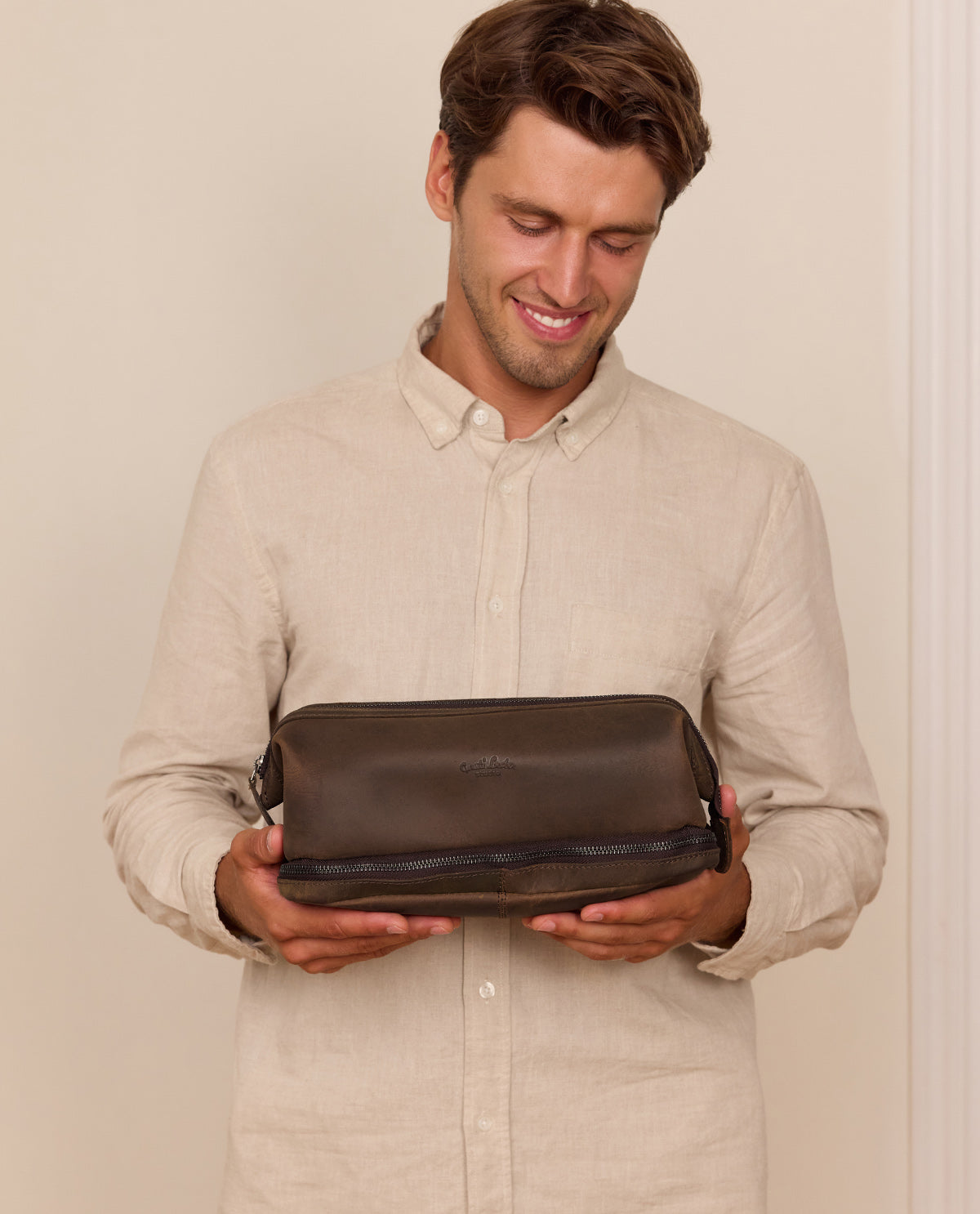 "Quinn"-toilettilaukku tuo järjestystä ja eleganssia matkatarvikkeisiisi. Valmistettu korkealaatuisesta nahasta, se yhdistää ajattoman designin toiminnalliseen varusteluun. Olipa kyseessä lyhyt viikonloppumatka tai pidempi reissu, "Quinn" varmistaa, että hygieniatuotteesi ovat turvallisesti ja tyylikkäästi pakattuna.