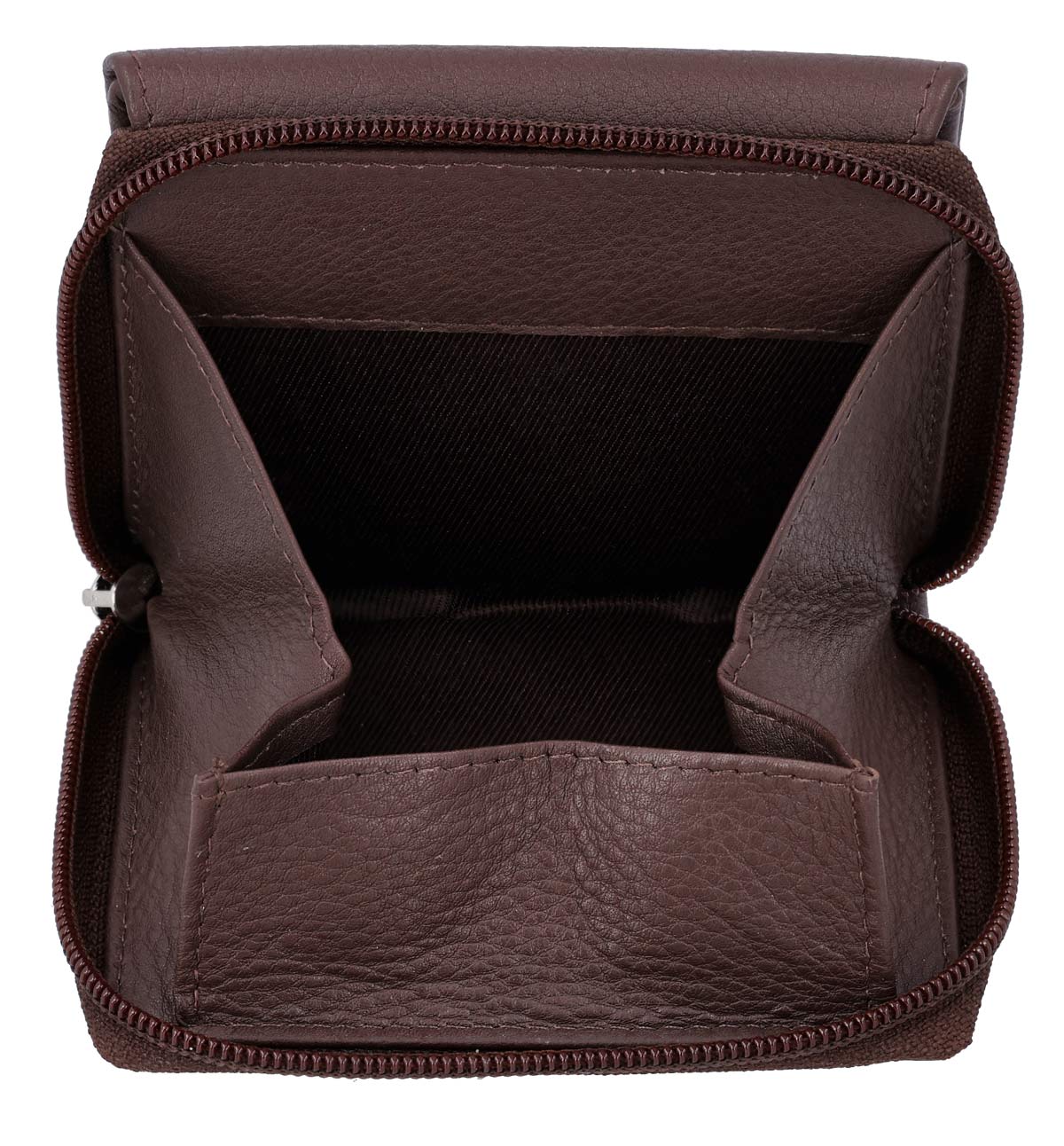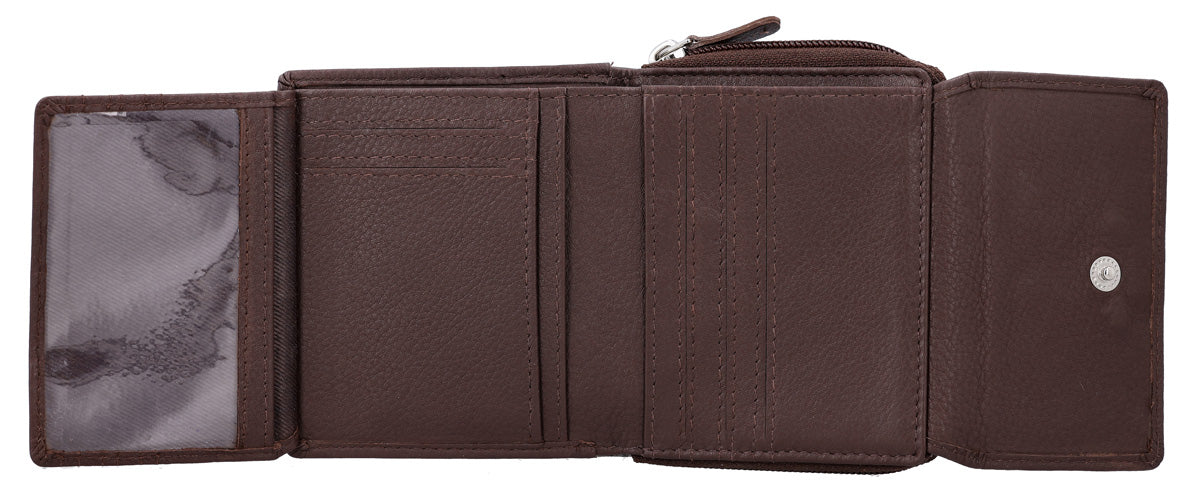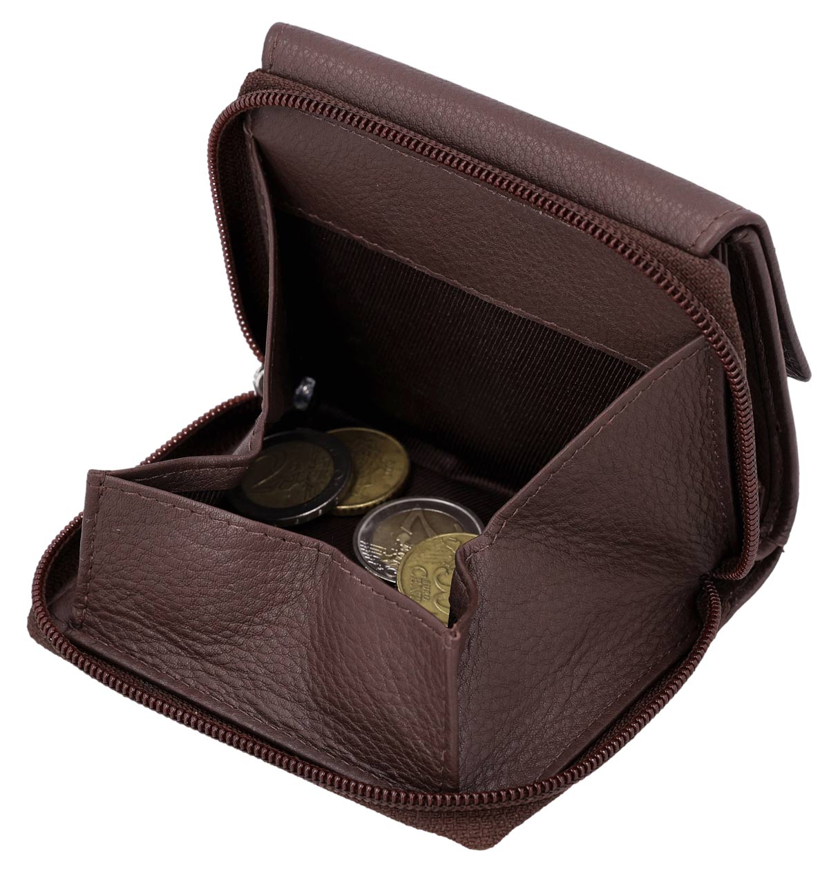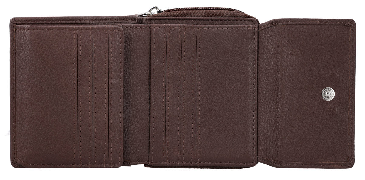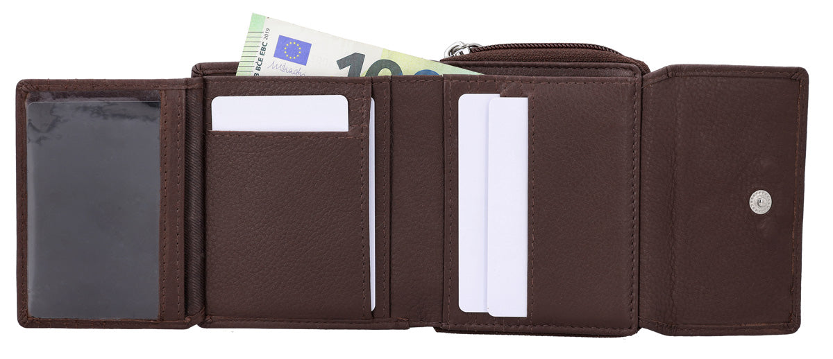 "Brigitta"-lompakon sisällä on setelitasku, avattava ikkunatasku, tilaa jopa kuudelle kortille sekä erillinen vetoketjullinen kolikkotasku, joka estää luotettavasti kolikoita putoamasta. Laadukkaasta nahasta valmistettu painonappisuljin pitää kaiken turvallisesti yhdessä. Ompelemalla kiinnitetty RFID-estäjä blokkaa korttiesi signaalit, joten luvattomilla henkilöillä ei ole mahdollisuutta lukea tietojasi. Kompakti, tyylikäs ja turvallinen lompakko jokapäiväiseen käyttöön.
