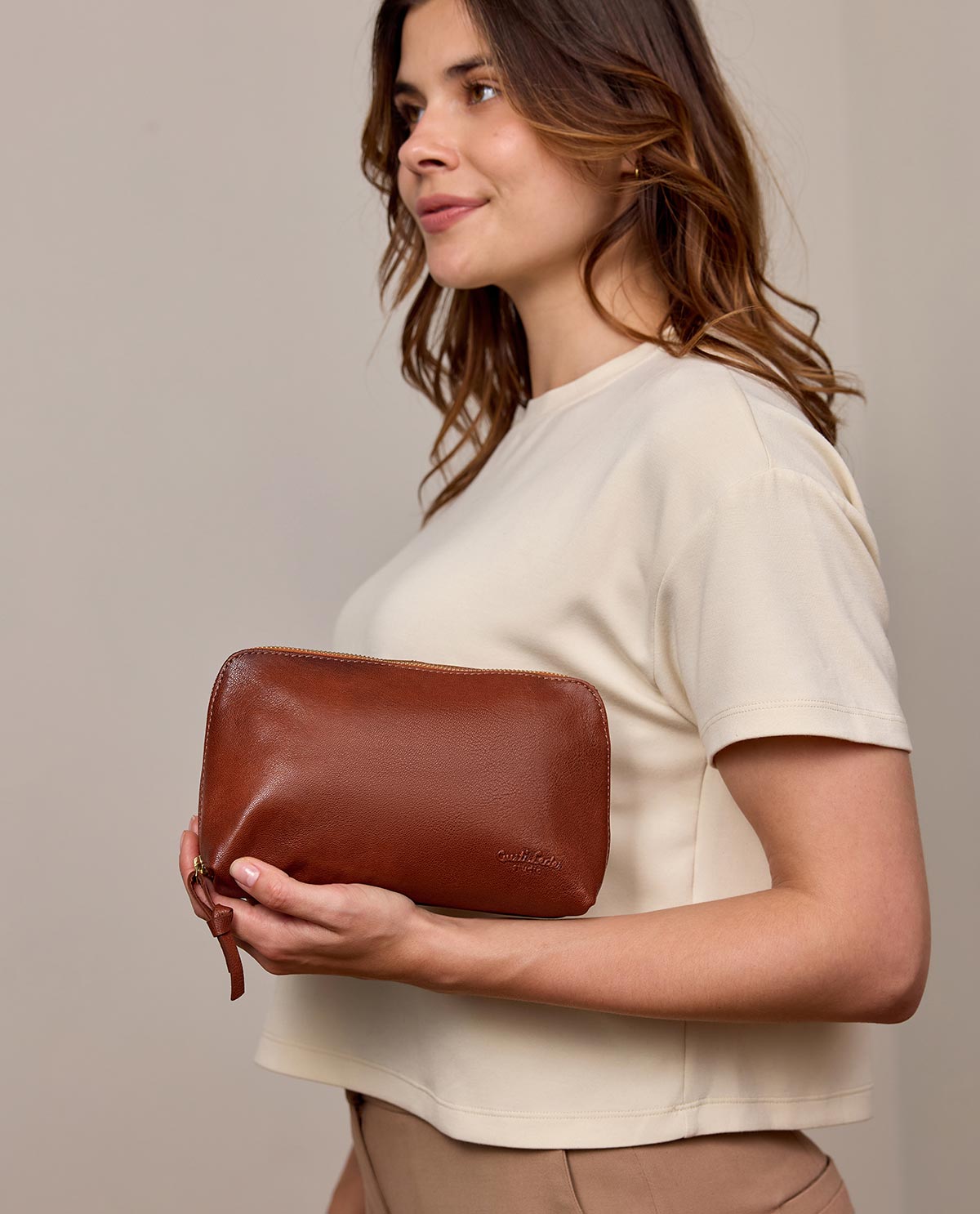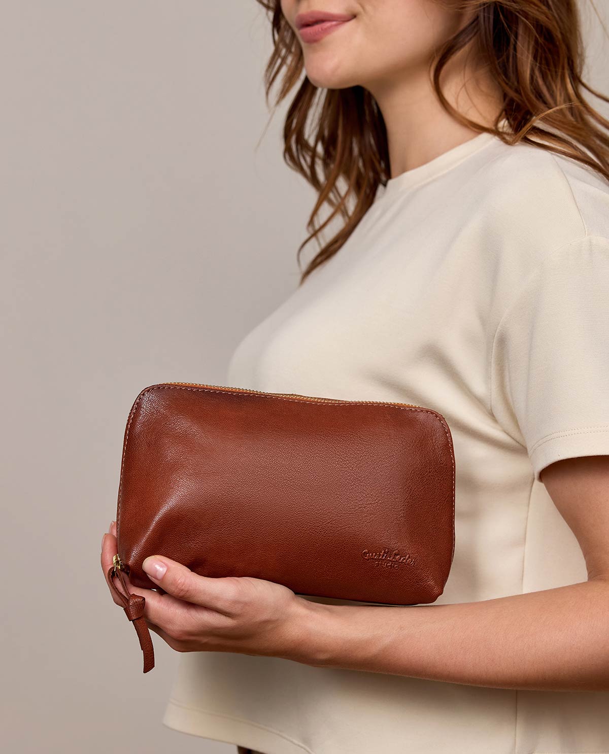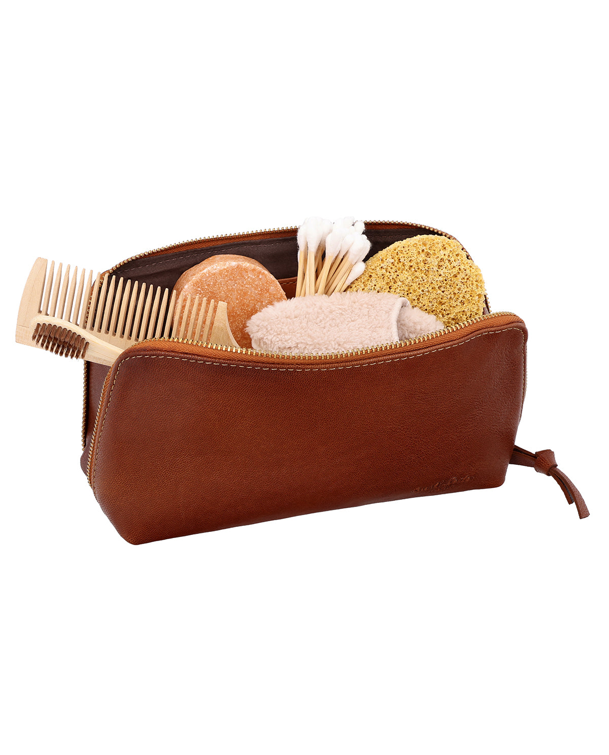 Korkealaatuisesta ja kestävästä nahasta valmistettu "Eli" tarjoaa täydellisen tilan kaikille hygieniatuotteillesi. Tilava päälokero sisällä tarjoaa tarpeeksi tilaa deodorantille, shampoolle, hoitoaineelle, hammastahnalle ja -harjalle ja paljon muulle. "Eli"n muotoilun kruunaa sopiva vetoketju. Näin kaikki pysyy yhdessä ja on optimaalisesti säilytettynä.